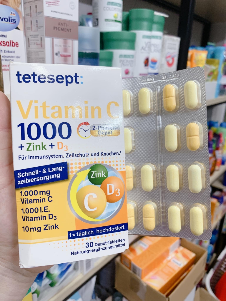 VITAMIN C 1000 + KẼM + D3 CỦA ĐỨC hãng TETESEPT - GIÚP TĂNG CƯỜNG SỨC ĐỀ KHÁNG & HỖ TRỢ XƯƠNG CHẮC KHỎE - 30v